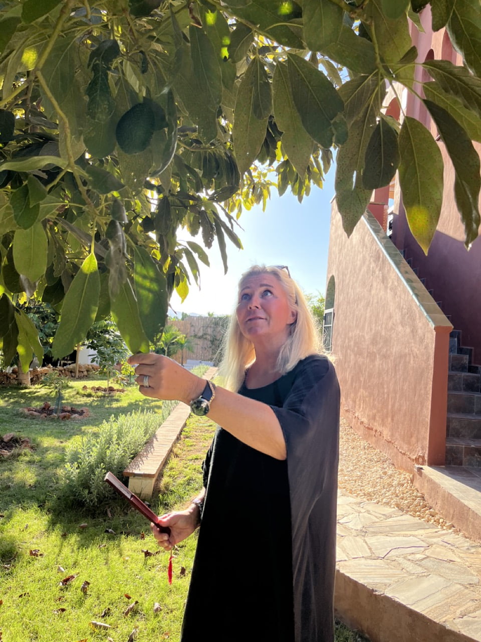 I hallen finns en otroligt vacker kaklad trappa som leder upp till den privata bostaden i övrigt delas alla utrymmen, terrasser och den vackra trädgården med gästerna. Elisabeth hade aldrig tidigare odlat eller varit intresserad av trädgård men när hon kom hit föll bitarna på plats och intresset är idag stort. Elisabeth kan skryta med en helt fantastisk fruktträdgård och naturligtvis är all mat hon serverar helt ekologisk. I sin trädgård kan hon plocka avokado, bananer, papaya, mango, citroner, lime, mandarin och apelsin, och det finns även en separat kryddträdgård. Minst två timmar per dag tillbringas i trädgården för omhändertagande av alla frukter och naturligtvis för att vattna. Elisabeth gör allt själv, och har hon tur är Johan hemma och kan avlasta lite.