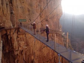 Renoveringen av ”Kungastigen” har pågått i över ett år. Och satsningen som kostat över fem miljoner euro har inte varit enkel. Byggnadsarbetarna har utbildats i klättring, fått stöd från luften av helikoptrar som har flugit in materialet. Ett imponerande glasgolv har monterats. Du går på glasgolvet och 100 meter under har du den mäktiga ravinen Los Gaitanes. Knappast en upplevelse för de som lätt får svindel.