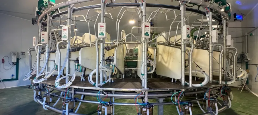 Nu visar Antonio upp den splitternya mjölkkarusellen som installerades för bara någon månad sedan. ”Getterna går in en och en, och så snurrar karusellen runt ett hack i taget tills det är dags att kliva ut igen,” förklarar han. Getter står cirka en meter över marken under mjölkningsprocessen. Själva mjölkmaskinen är toppmodern som själv känner av när mjölken är slut hos geten och släpper genast taget om spenarna för att inte orsaka skador. Här mjölkas 25 getter varje morgon och kväll, vilket ger en total mjölkproduktion på cirka 1 150 liter om dagen. ”All mjölk levereras varje morgon till mejeriet,” säger Antonio. ”Skulle det mot förmodan bli mjölk över, så levereras den till ett kooperativ som tar hand om den”.