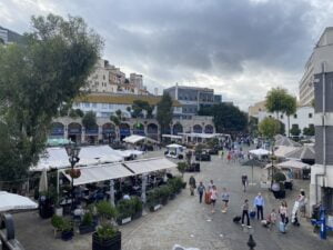 Torget Casemates där Main Street börjar har folkvimmel och ”Fish and chips” eller brittisk paj.
