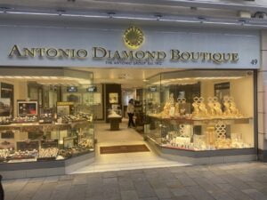 Ädelstenar och diamanter. Mycket glitter i butikerna längs Main Street.