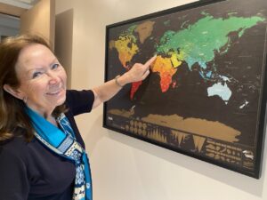 Hon har besökt kvinnor i Etiopien. Varit projektledare i ett Rotaryprojekt med att bygga ett familjecentrum i ett av Nairobis slumområden. Eller arbetat i Angola efter inbördeskriget, flyktingförläggningar i norra Irak 2016 och träffat kvinnor som könsstympats i Somalia.