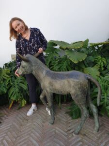 Britt-Marie och Platero, åsnan som nobelpristagaren Juan Ramón Jimenez har skrivit om i sin mest berömda bok ”Platero y yo”. Bilden är tagen i författarens hus (numera museum) i hans födelseby Moguer.