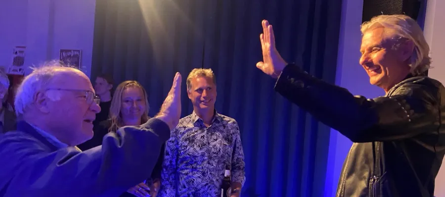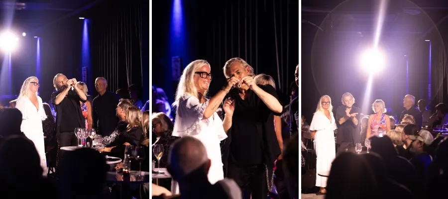 Mark Skårman, ägare till Plaza de Toros, lämnar över en blommor till Joe Labero efter succéshowen