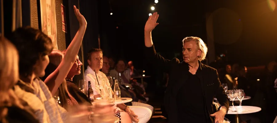 Den intima teatern med en lång scen har plats för upp till 150 gäster. Joe Labero rörde sig vant ute bland publiken vilket gav en personlig och nära upplevelse.