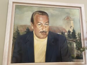 Prins Alfonso de Hohenlohe-Langenburg framför Finca Margarita. Målningen hänger till höger efter hotellets entré.