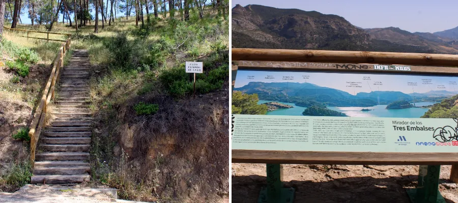 Du hittar utsiktspunkten El mirador de los Tres Embalses genom att gå upp för trappan vid landsvägen mot Campillos. Utsiktsplatsen ligger på 486 meters höjd över havet inom Campillos kommungräns.
