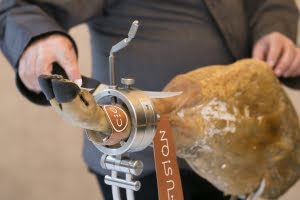 Att skära upp en jámon ibérico i lövtunna skivor är en konst. Det är en mycket svår konst att hantera de långa sylvassa knivarna till att skära upp ytterst fina tunna skivor.
