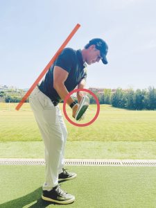 Baksving. På den här bilden ser du ett perfekt exempel på hur din baksving ska se ut, vänster axel under hakan. Klubbbladet ska vara