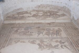 Att bostäder var utsmyckade med mosaik visade ägarens starka köpkraft och rikedom. Troligen hade många av invånarna en högt uppsatt position som militärer. Mosaiken bygger på mytologi och här finns de tre gracerna, ett slags glädjens gudinnor, som i den grekiska mytologin var döttrar till Zeus och Eurynome. Annan mosaik föreställer Bacchus som i romersk mytologi var rusets och vinets gud.