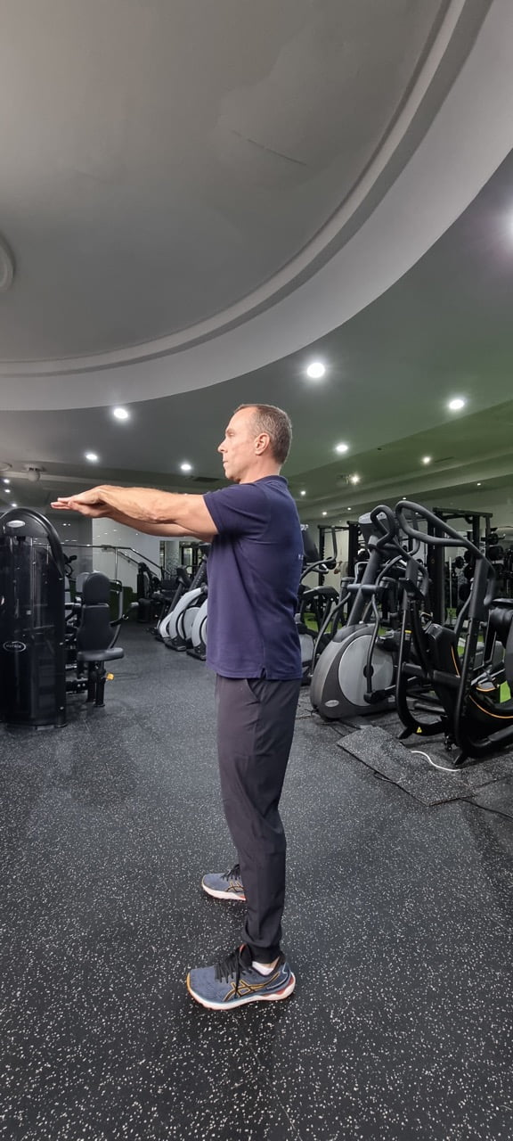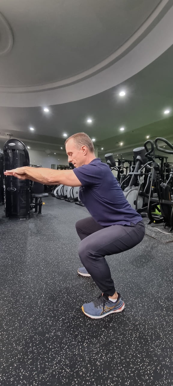 Knäböj är en bra basövning för att engagera hela underkroppen. Viktiga muskler för att gå, springa och ställa sig upp. Vi ställer oss axelbrett och tar fram händerna framför kroppen. Sedan sätter vi oss neråt bakåt så djupt vi kan med bibehållen hållning. Vi vänder sedan uppåt.