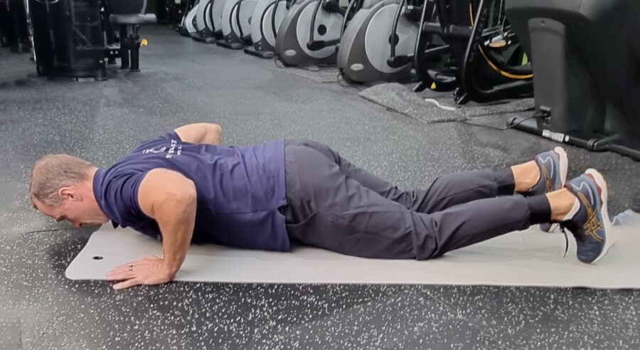 Armhävning är en bra övning för att engagera överkroppen och som kan göras av de flesta. Man kan göra den med raka ben, men jag valde den lättare varianten på knä för att visa grunden. Vi är raka i kroppen och sätter händerna utanför axlarna. Vi går så djupt vi kan med rak kropp utan att vila i botten sen går vi rätt upp. Viktiga att tänka på är att hålla kroppsformen med rak rygg.