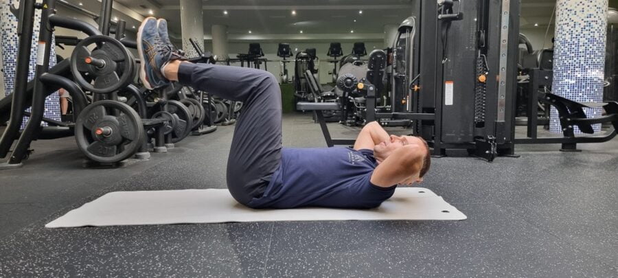 Crunchs är en bra övning för att stärka bålen och få en rörelse över ryggraden. Vi lägger oss på ryggen med böjda knän och fattar händerna bakom huvudet. Vi ska stödja huvudet och inte dra i det. Samtidigt som vi blåser ut så närmar vi huvudet mot knäna.