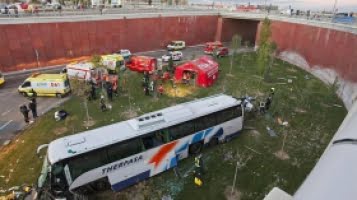 38 bussresenärer överlevde kraschen när en buss körde av vägen och störtade sju meter ned vid tågstationen Delicias i Zaragoza tidigt på fredagsmorgonen.