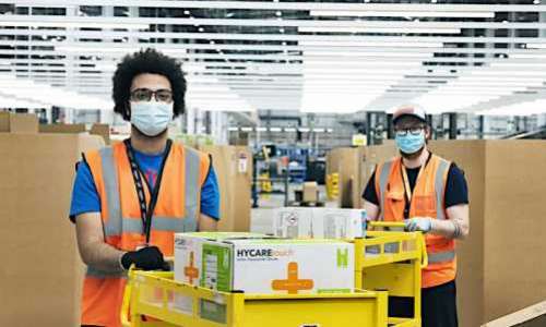 Amazon har idag i Spanien mer än 28 olika anläggningar, inklusive logistik- och distributionscentra, logistikstationer, kontor, utvecklingscenter för mjukvara samt ett FoU-center som är specialiserat på maskininlärning och artificiell intelligens. Bildtext: Amazon logistikpersonal, foto: amazon.es.