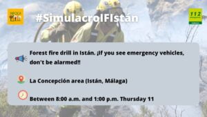 Mellan klockan 08 till 13 på torsdagen är det skogsbrandövning i Istán norr om Marbella. Infoca skriver på Twitter och uppmanar allmänheten att köra försiktigt på A-7176:an eftersom många utryckningsfordon befinner sig i området. Det finns ingen anledning till oro då det är en övning.