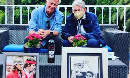 Bildtext: Björn Borg och Manolo Santana möttes sista gången i april ifjol. Santana avled 11 december. (Foto: Twitter @ManoloSantanaRC)