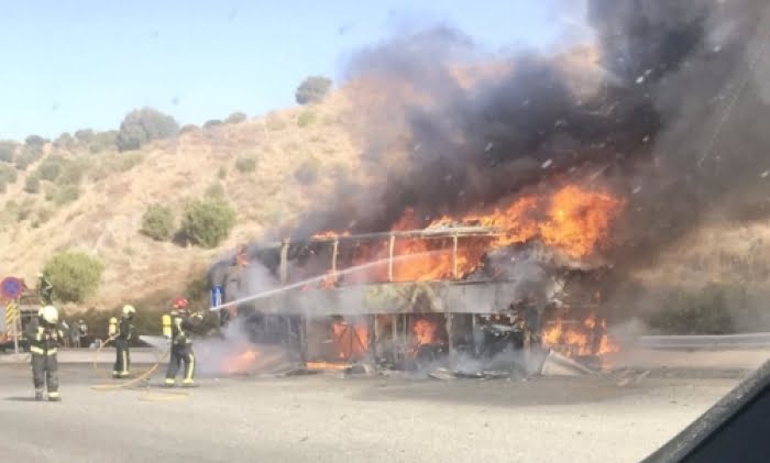 En buss med 45 passagerare började vid elvatiden på fredagen att brinna på betalmotorvägen AP-7:an i Mijas kommun. Enligt larmcentralen Servicio de Emergencias 112 Andalucía skadades ingen person.
