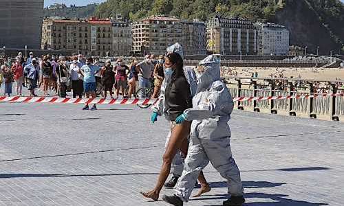 En kvinna som skulle ha befunnit sig i karantän upptäcktes surfande på playa Zuriola i San Sebastián i Baskien. Kvinnan var annars livräddare på playa La Concha och polisen tipsades om hennes brott mot karantänen av sina egna kollegor som kände igen henne.