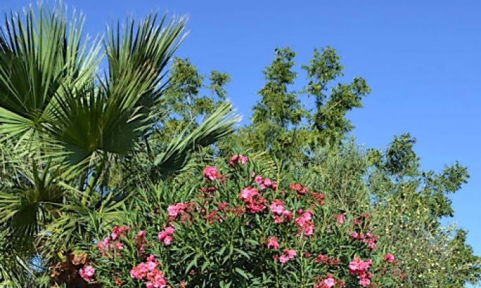 Bildtexter: En färsk höstbild från idag förmiddag, till vänster en palm, i förgrunden Oleander, i bakgrunden ett Pekanträd och i nedre högra hörnet ett olivträd som snart är klart att skörda. Foto J. Erixon.