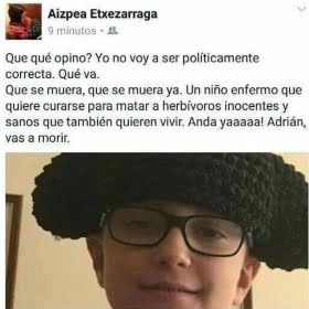 På sociala nätverk skriver djurrättsaktivisten Aizpea: ”Låt pojken dö. Ett sjukt barn som vill döda oskyldiga och friska växtätare som vill leva. Kom igen nu Adrián! Dö!”.