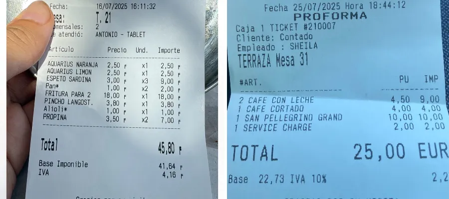 Nyligen besökte ett sällskap på tre personer en strandklubb i Estepona och tog in tre kaffe och en flaska vatten. På notan var serveringsavgift medtagen och totalt gick notan på 25 euro.