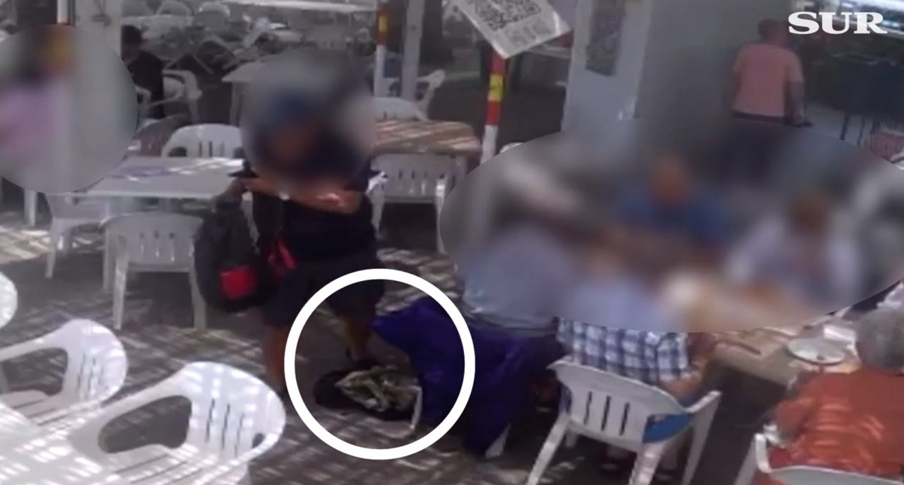 Händelsen på Chiringuito Ayo inträffade vid middagstid på måndagen. En film visar hur en man med ryggsäck i handen närmar sig ett bord. En kvinna som sitter vid bordet har sina saker i en väska och påse på golvet vid stolen.