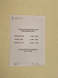 Måndag 29/8 klockan 14-16, tisdag 30/8 klockan 14-16 och onsdag 31/8 klockan 14-16.