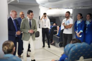 Juanma Moreno skojade friskt med flygläraren som satt bredvid honom som blev kallad Pedro ”El Bueno”, Pedro den duktige, då han heter Pedro Sánchez.