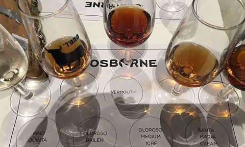 Efter vinprovningar i Ronda och Lebrija var det sherryprovning i Puerto Santa de Maria på Osborne. Vid den kända bodegan med tjuren som logga provades fem drycker, fyra sherry och en vermouth.