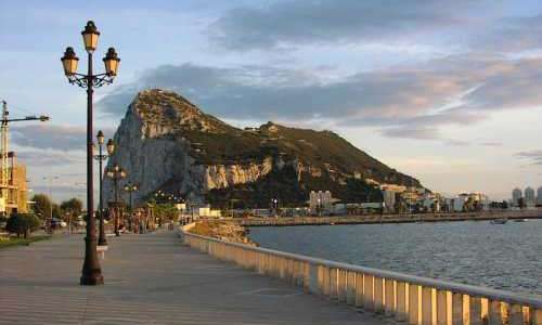 Bildtext: Gibraltar i solnedgången, fotograferat från La Línea de la Concepción, foto: Doctor Ron (Wikimedia Commons).