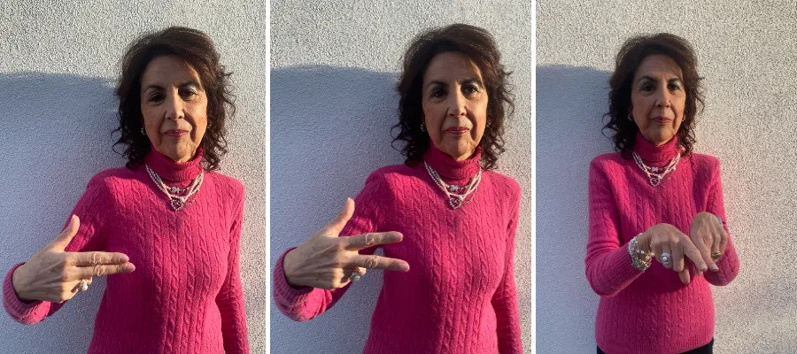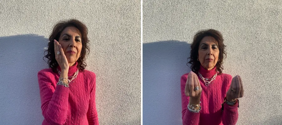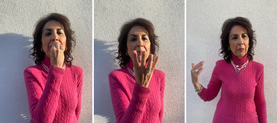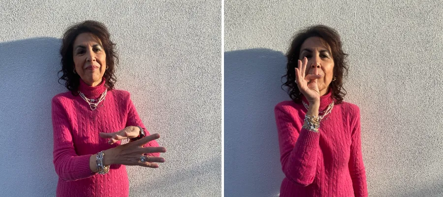 Fr. v. Gesten för att uttrycka ”Nu går vi” gör man genom att med den ena handen slå mot undersidan på den andra handen en eller två gånger. T. h. För att ge eftertryck åt vad vi just har sagt, kan vi forma ett kors med tummen och pekfingret, ge det en kyss och samtidigt kanske säga ”POR ÉSTAS” (för detta). Nu för tiden används denna gest av få personer.