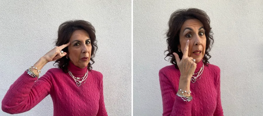 Fr. v. För att visa att man tycker att någon är lite dum, har man en ganska internationell gest. Man håller ena pekfingret mot tinningen och skruvar några gånger. T. v. När man vill varna någon, sätter man ett pekfinger under ena ögat.