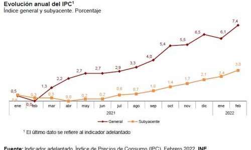 När siffrorna över konsumentprisindex (KPI) presenterades på måndagen visade det sig att priserna under februari ökade med 0,6 procent jämfört med januari. På årsbasis blir det en ökning på 7,4 procent, den högsta på 33 år sedan juli 1989. Det visar färska siffror från Spaniens motsvarighet till Statistiska centralbyrån INE (Instituto Nacional de Estadística).