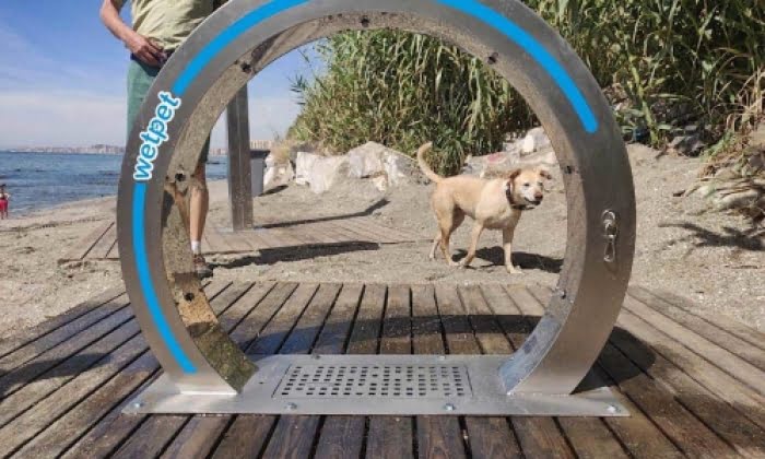 Bildtext: Dusch för hundar på Playa canina Benalcán, Benalmádena.