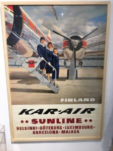 En åtta timmars flygresa med bolaget Kar-Air på 1950-talet från Helsingfors och Göteborg vidare till Luxemburg, Barcelona och Málaga. På väggen rullar den första turistfilmen som spelades in på Solkusten. Det var super-8 film som visade en flygtur över Spanien, landningen i Málaga och det första chartermålet.
