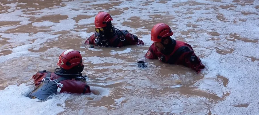 Räddningsarbetare söker efter pappan till pojken som hittades på söndagskvällen. (Foto: X@bomberscat)