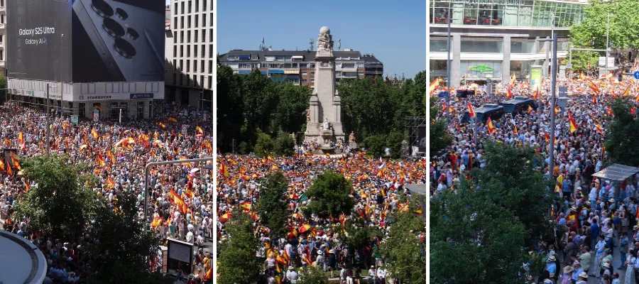 Mellan 50 000 och 100 000 samlades på söndagen på Plaza España i Madrid för att delta i en demonstration mot socialistregeringen och regeringschefen Pedro Sánchez.