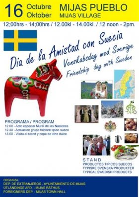 På tisdag den 16 oktober arrangerar Mijas kommun ”Día de la Amistad con Suecia” från klockan 12. Händelsen kommer även att uppmärksammas genom att en keramikplatta placeras i Nationernas mur, Mural de las Naciones, som invigdes i somras under Festival Internacional i Mijas.