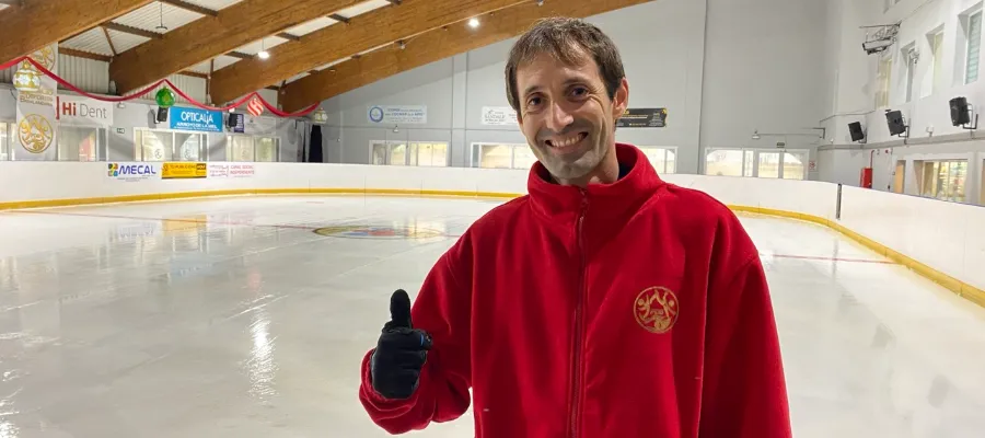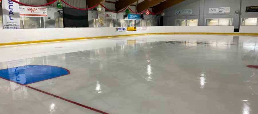 Den som kikar in i Palacio Deportes i Arroyo de la Miel i Benalmádena kan se hur ismakare lägger säsongens första is.