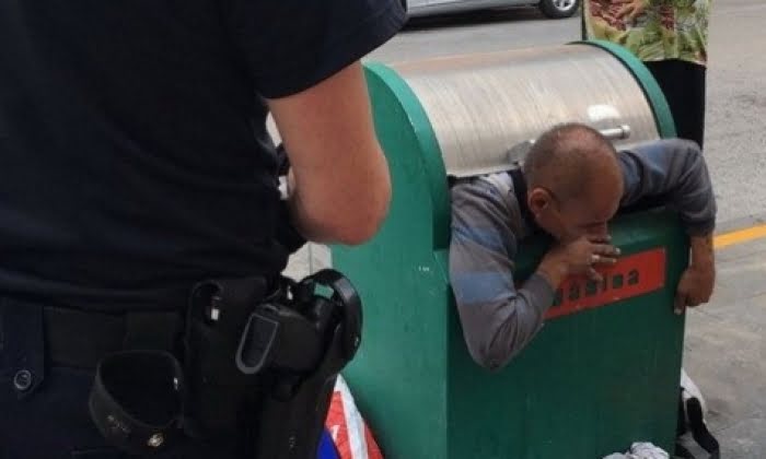 Händelsen inträffade tidigt på söndagsmorgonen den 28 april i norra delen av Málaga vid en rondell utmed avenida de Simón Bolívar. Poliserna upptäckte då en person vars halva kropp hängde utanför behållaren för insamling av begagnade kläder.