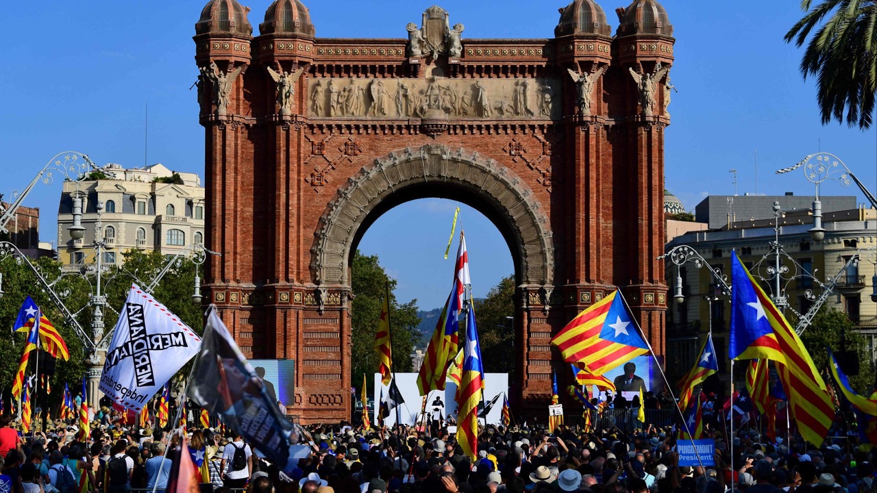 I stället nöjde han sig med att framträda på en offentlig plats vid Triumfbågen, Arco del Triunfo, ett stycke från parlamentet inför några tusen katalanska anhängare och separatister.