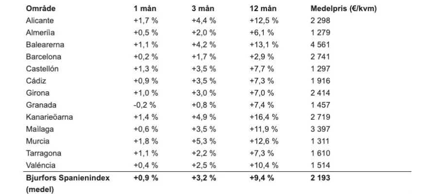 Bjurfors Spanienindex täcker 13 provinser och regioner som svenskar gärna väljer. Från Girona i nordost till Cádiz i sydväst, och från Balearerna i Medelhavet till Kanarieöarna i Atlanten. I september steg indexet med 0,9 procent till en ny rekordnivå, och sett över de senaste tolv månaderna är ökningen 9,4 procent – vilket överträffar prisökningen för Spanien som helhet (+8,7 %).