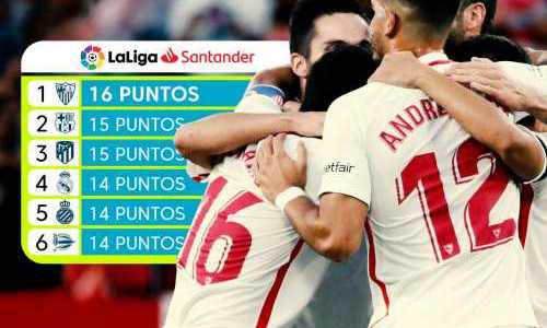 Sevilla leder La Liga på 16 poäng före Barcelona och Atletico Madrid som båda har 15 följt av tre lag på 14 poäng; Real Madrid, ESpanyol och Alavés.