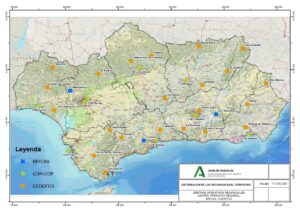 Kartan med prickar visar var den andalusiska brandbekämpningsmyndigheten Infoca är stationerade.
