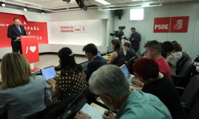 Maktpartiet PSOE:s partisekreterare José Luis Ábalos sa vid en presskonferens under gårdagen (bilden) att han räknar med att Pablo Iglesias, Albert Rivera och Pablo Casado kommer att agera med ansvar och släppa fram en socialistisk minoritetsregering.