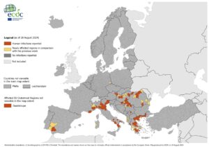 Sjukdomsfall förekommer i stora delar världen. I Europa sprids viruset framför allt i de södra och östra delarna.