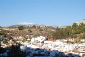 Efter en krispigt kall natt med temperatur runt noll i Guadalhorce-dalen, ligger ett tunt snölager på bergstoppen La Torrecilla i Sierra de las Nieves. Bilden visar byn Monda med Sierra de las Nieves i bakgrunden.