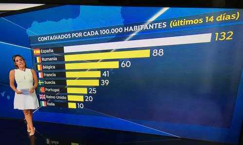 Spanien är klar etta i Europa sett till antalet nya smittade i covid-19 de senaste två veckorna. Spanien har 132 registrerade fall per 100.000 invånare medan grannlandet Portugal bara har 25.