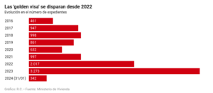 Under ett regeringssammanträde förklarade bostadsminister Isabel Rodríguez att antalet sådana visum som utfärdas har stigit från 461 under 2016, till 997 under 2021, sedan till mer än det dubbla (2 017) 2022 och ytterligare 3 273 ifjol.